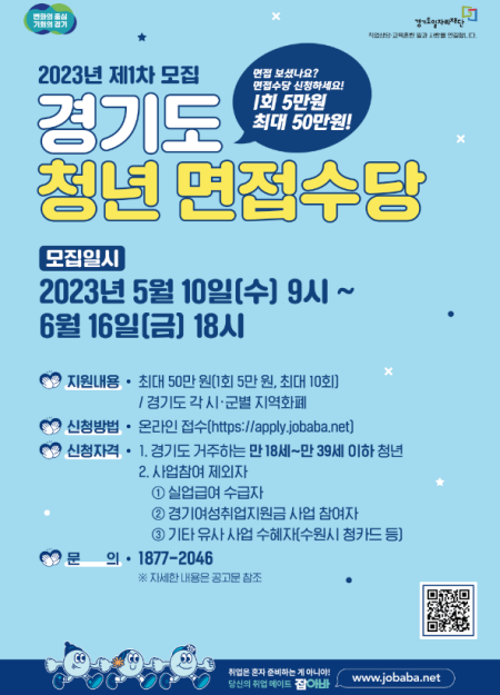 제2023-052호 『2023년 경기도 청년 면접수당』 모집 공고 경기도 청년의 적극적 구직활동을 지원하고자 「경기도 청년 면접수당」 지원 대상자 모집을 아래와 같이 모집 공고합니다. 2023년 5