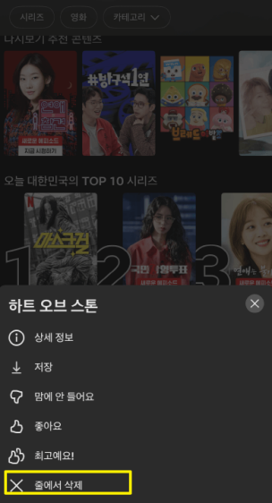 번외. 넷플릭스 앱 > 메인 > 프로필의 시청중인 목록 > 삭제하고 싶은 콘텐츠 제목 아래 더 보기(쩜 세개) 선택 > 줄에서 삭제