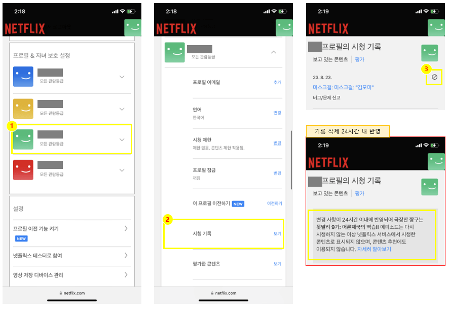 STEP 2. 계정 > 프로필&자녀 보호 설정 > 프로필 선택 > 시청 기록 선택 > 시청 기록 삭제