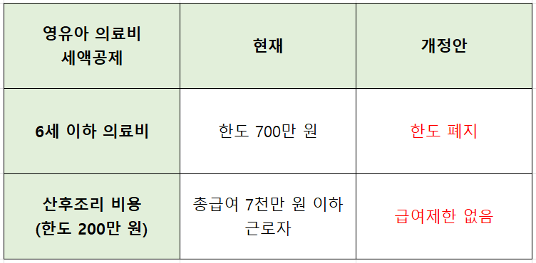 2. 영유아 의료비 세액공제 확대(의료비 공제 확대, 산후조리비 급여기준 폐지)