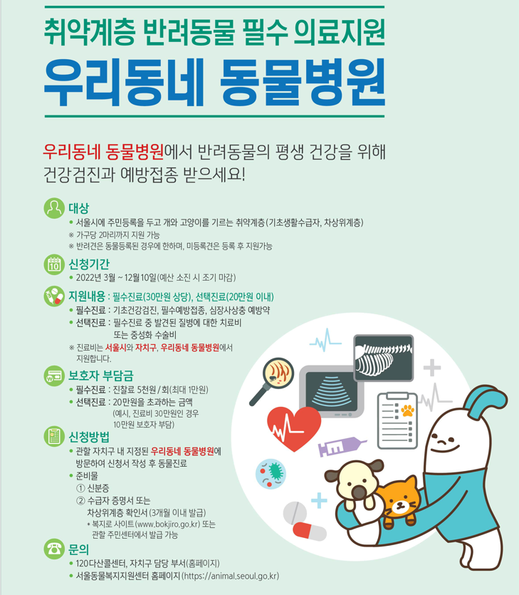 주소지 관할 자치구 내에서 개 또는 고양이를 기르는 기초생활수급자, 차상위 계층, 한부모 가족이 지원 자격에 해당하고, 반려동물과 함께 '우리 동네 동물병원'을 방문하면 진료받을 수 있다.